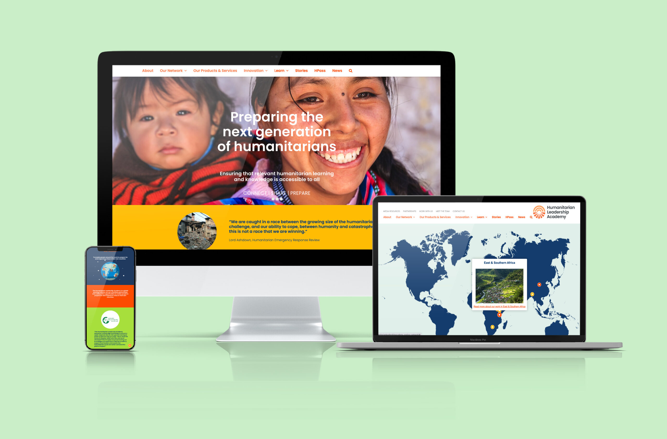 a mockup of Humanitarian Leadership Academy website design on desktop, laptop and mobile