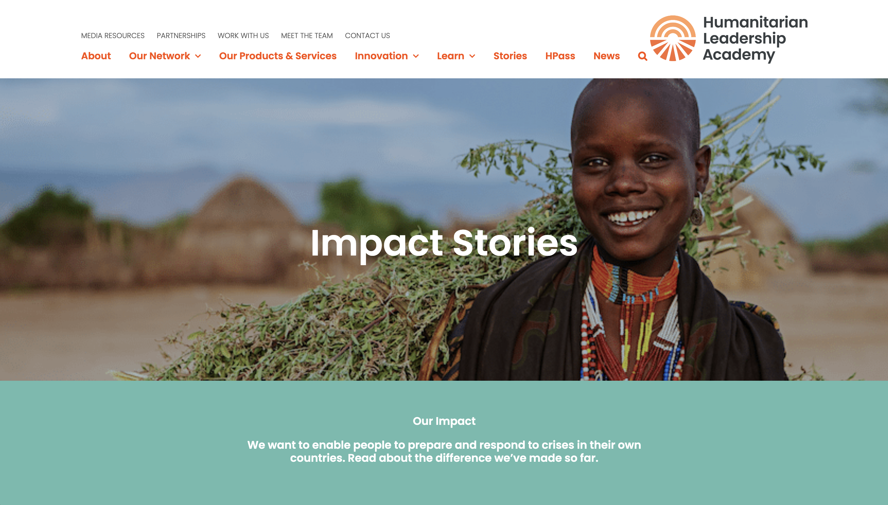 a view of Impact stories listed on the Humanitarian Leadership Academy website